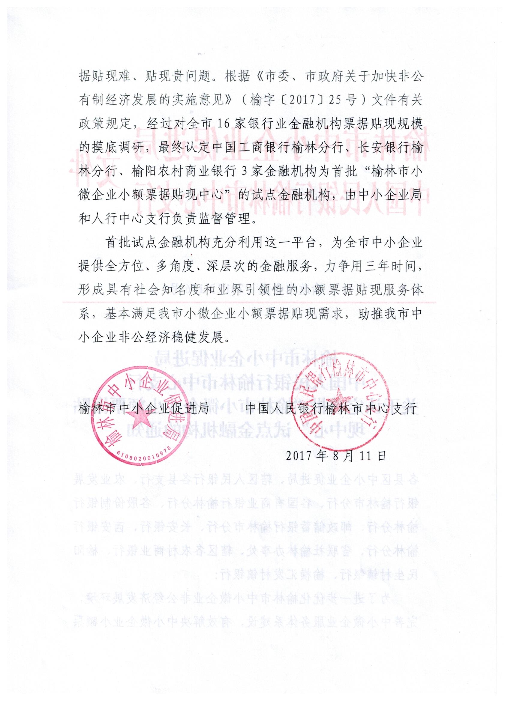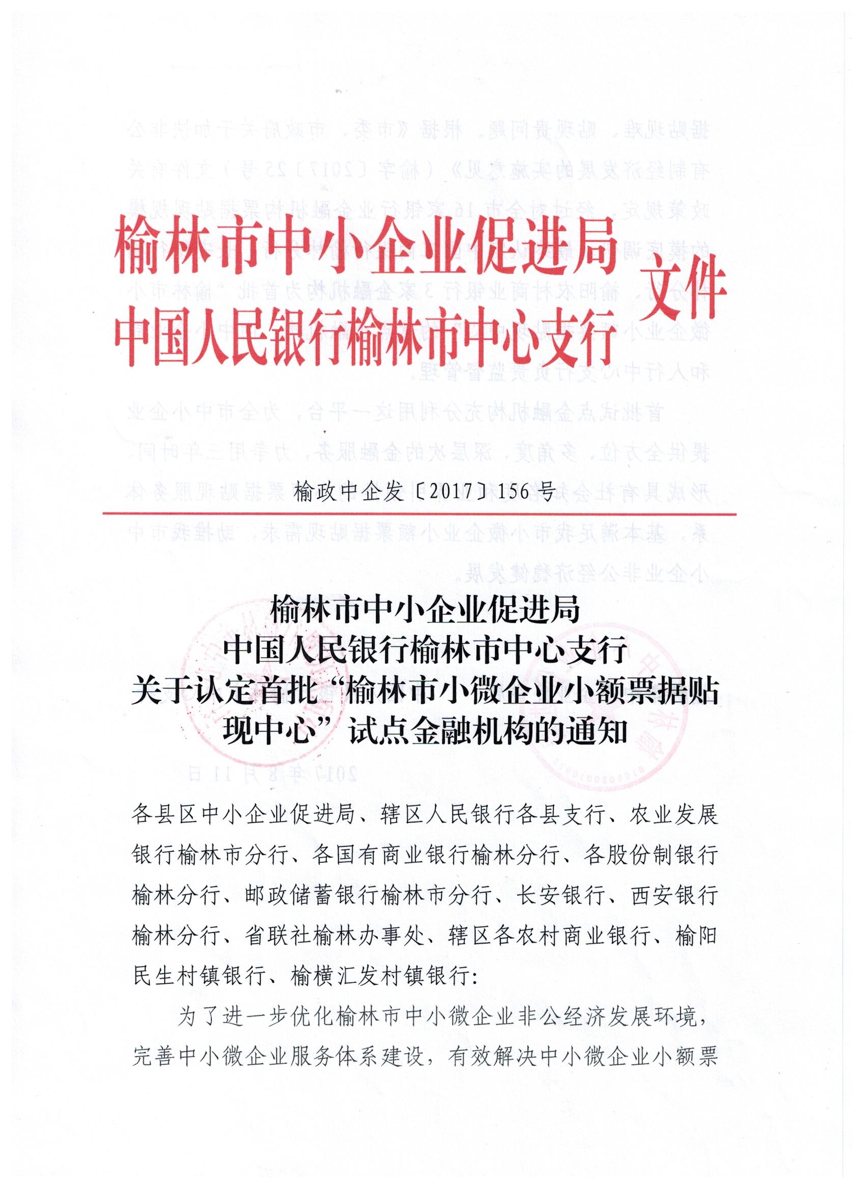 关于认定首批“榆林市小微企业小额票据贴现中心”试点金融机构的通知
